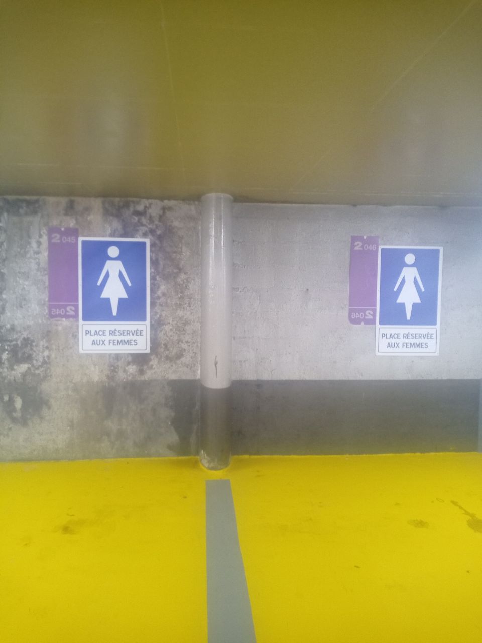 Ces quelques rappels étant faits, je dois maintenant vous raconter une anecdote : je vais parfois garer ma voiture dans un parc de stationnement souterrain de Metz. Pendant quelques semaines, le niveau -1 en a été inaccessible. Récemment, ce 17 septembre 2025, j’ai eu l’occasion de me rendre à une réunion, accompagné par une amie. Et qu’ai-je découvert ? Les travaux avaient servi à placer des panneaux « place réservée aux femmes » sur toute une rangée de place de stationnement, comme ceci :