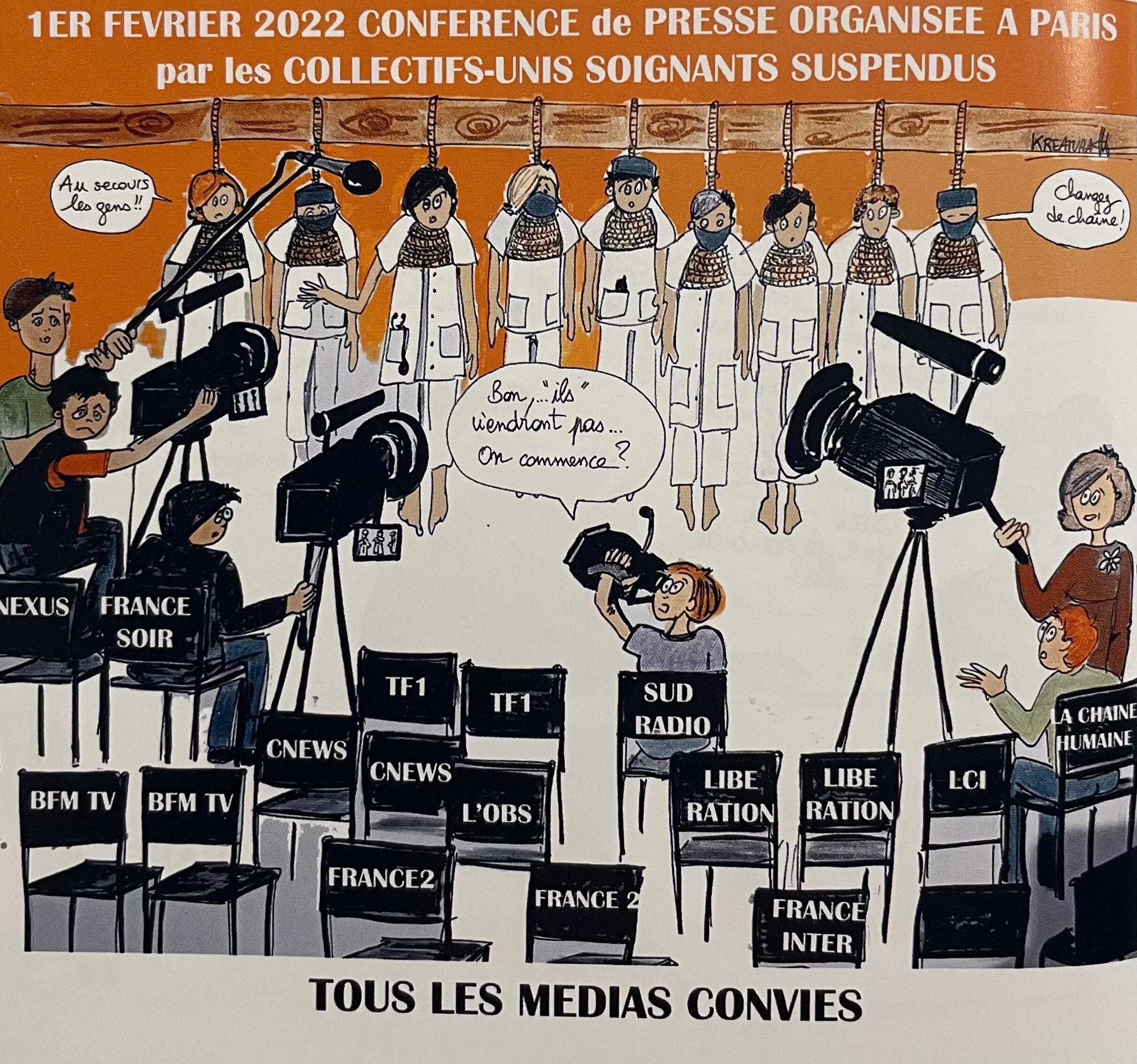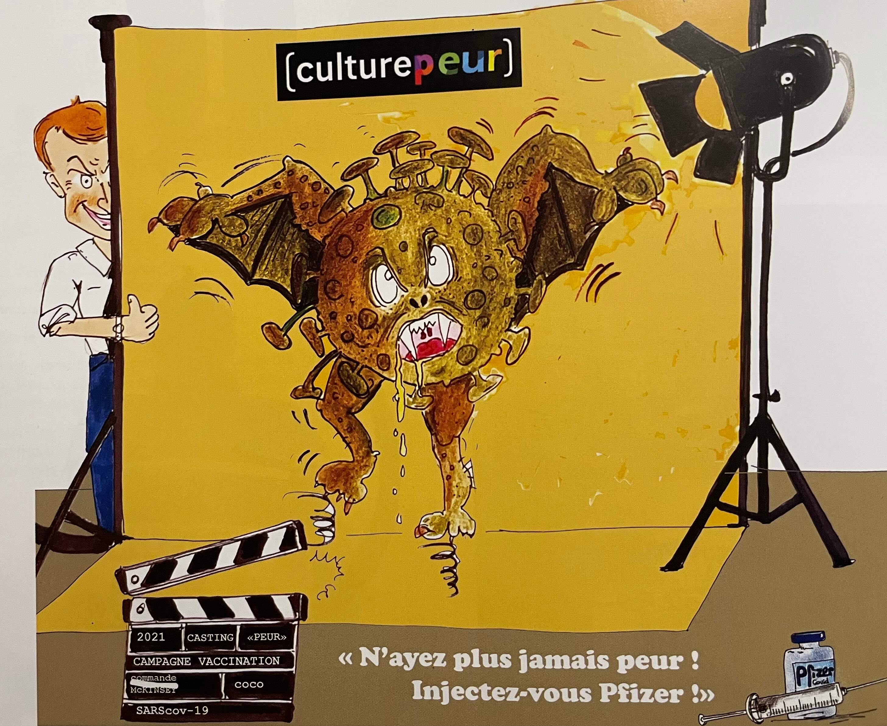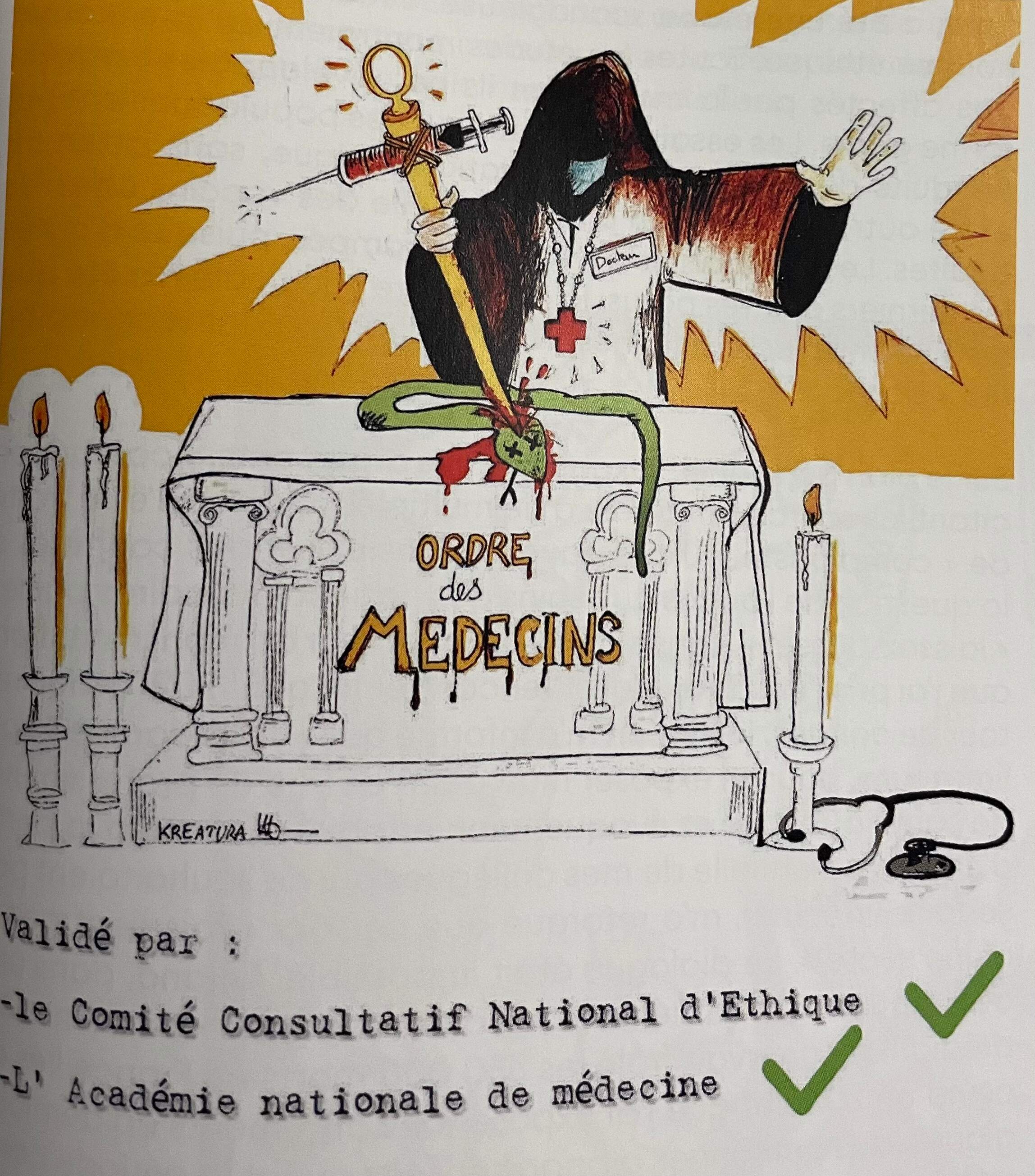 Sabine, alias Kreatura, est une soignante qui s’exprime au travers de son talent de dessinatrice. Ses illustrations gaies et colorées illustrent bien mieux que mille mots la folie qui a été volontairement et savamment instillée depuis 2020. Ses croquis mettent en évidence la déraison, la violence, la déconnexion de la réalité et la peur qui s’est propagée par contagion délirante. Cette dénonciation sous la forme de dessins de type bande dessinée permet un chemin à la conscience en contournant le déni psychiquement protecteur face à ces horreurs qui ont été perpétrées. Paradoxalement, la distance qu’impose ce style nous touche plus profondément, plus sensiblement, plus humainement.