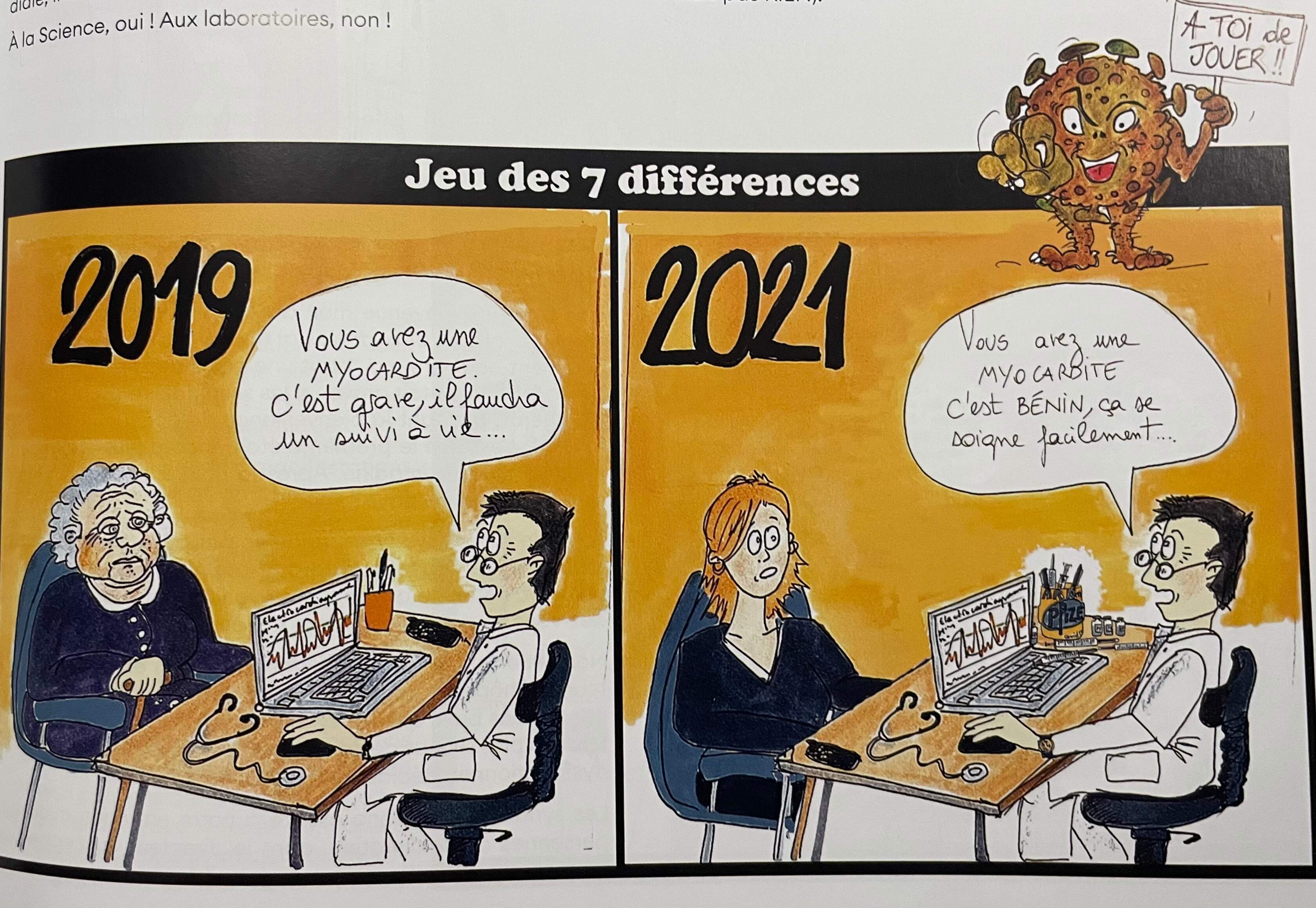 Ses dessins accompagnent ensuite une série témoignages ; 18 hommes et femmes, soignants, infirmiers, brancardière, médecin, aide-soignantes. Chacun y raconte plus ou moins longuement sa traversée de la crise, ses ressentis, le choc de l’annonce du 12 juillet qui menait à l’obligation pour eux de s’injecter un produit expérimental, leurs cheminements psychologiques dans ce parcours jalonné de traumatismes répétés, leurs réflexions sur la science, la psychologie, la propagande mais aussi leur désespoir, leurs actions, face à la chronique de leur mort (sociale) annoncée, leur déchéance orchestrée et l’effritement de la solidarité.