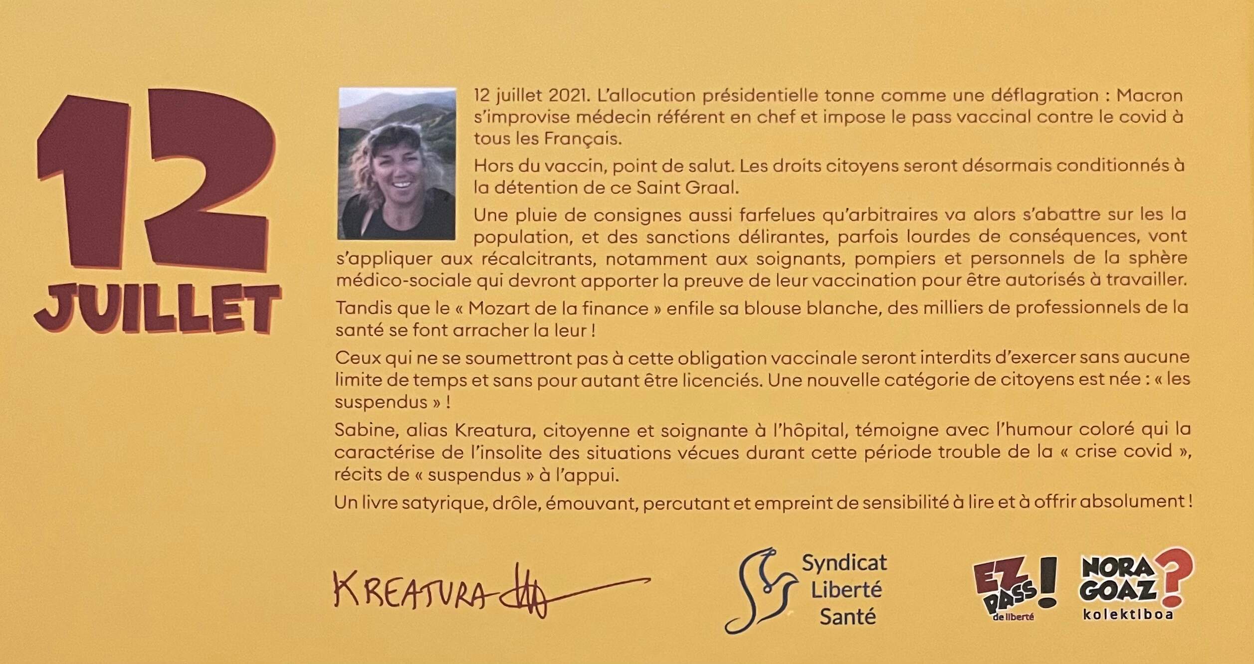 Sabine, alias Kreatura, est une soignante qui s’exprime au travers de son talent de dessinatrice. Ses illustrations gaies et colorées illustrent bien mieux que mille mots la folie qui a été volontairement et savamment instillée depuis 2020. Ses croquis mettent en évidence la déraison, la violence, la déconnexion de la réalité et la peur qui s’est propagée par contagion délirante. Cette dénonciation sous la forme de dessins de type bande dessinée permet un chemin à la conscience en contournant le déni psychiquement protecteur face à ces horreurs qui ont été perpétrées. Paradoxalement, la distance qu’impose ce style nous touche plus profondément, plus sensiblement, plus humainement.